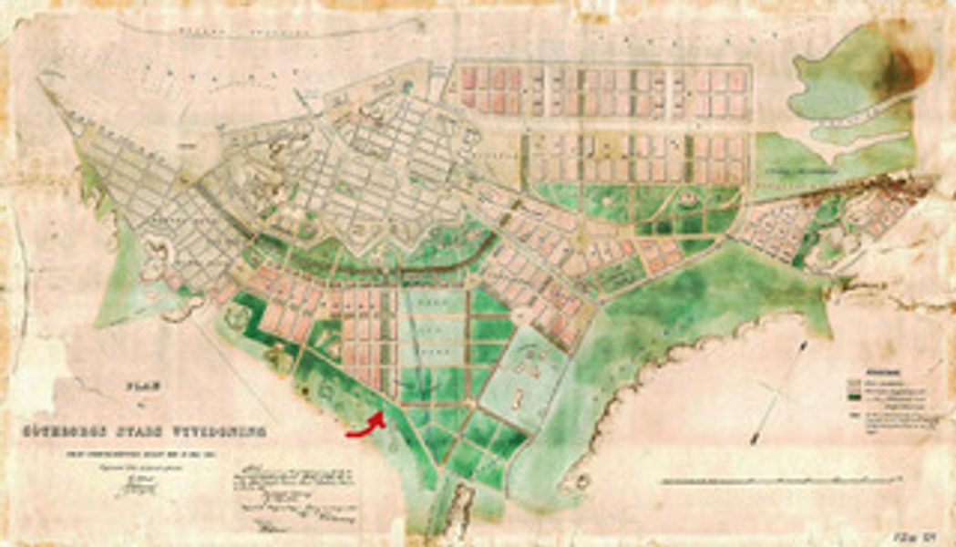 Jag hittar på en gammal karta från 1864. Men jag inser snart att just den här kartan inte alls visar Staden, så som den faktiskt såg ut vid den tiden. Det här är snarare en bild av en tänkt Stad - "så som den skulle kunna bli".